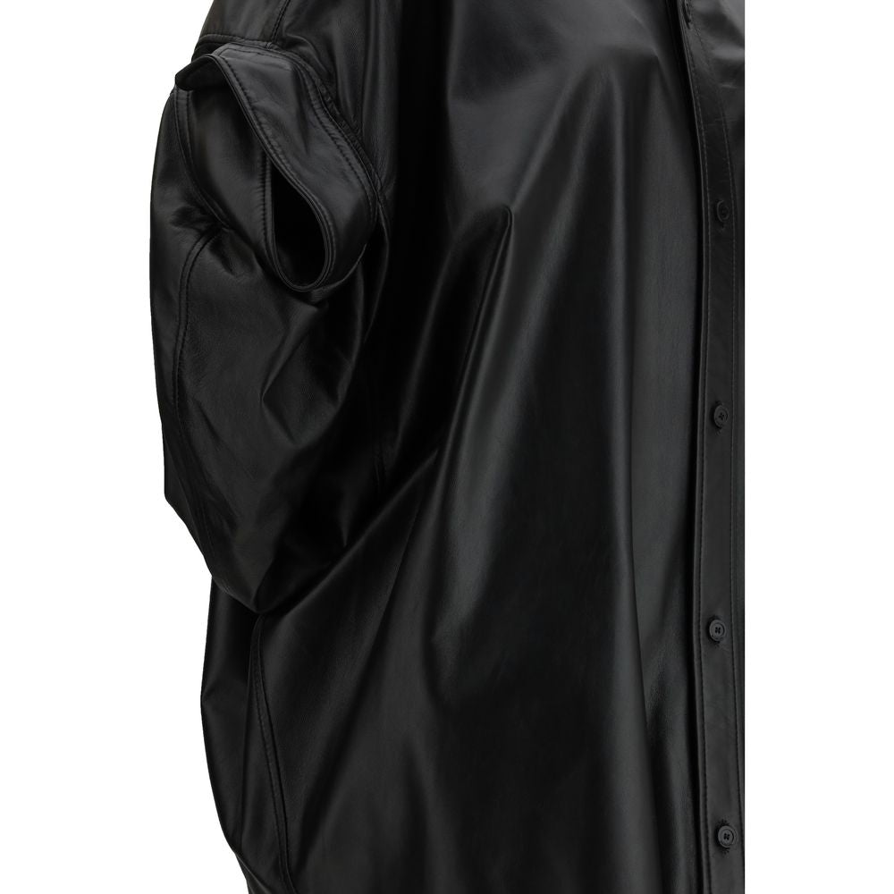 The Tucked Sleeves Shirt by Balenciaga reimagines the classic shirt with a bold and refined edge. Crafted from shiny smooth lambskin, it stands out for its innovative short sleeves tucked-inside effect, creating unexpected volume and structure. A traditional shirt collar, six-button front closure, and chest patch pocket ground the design in tailoring, while the rounded hem adds fluidity. A statement piece that reflects Balenciaga’s experimental spirit and modern, unconventional elegance.