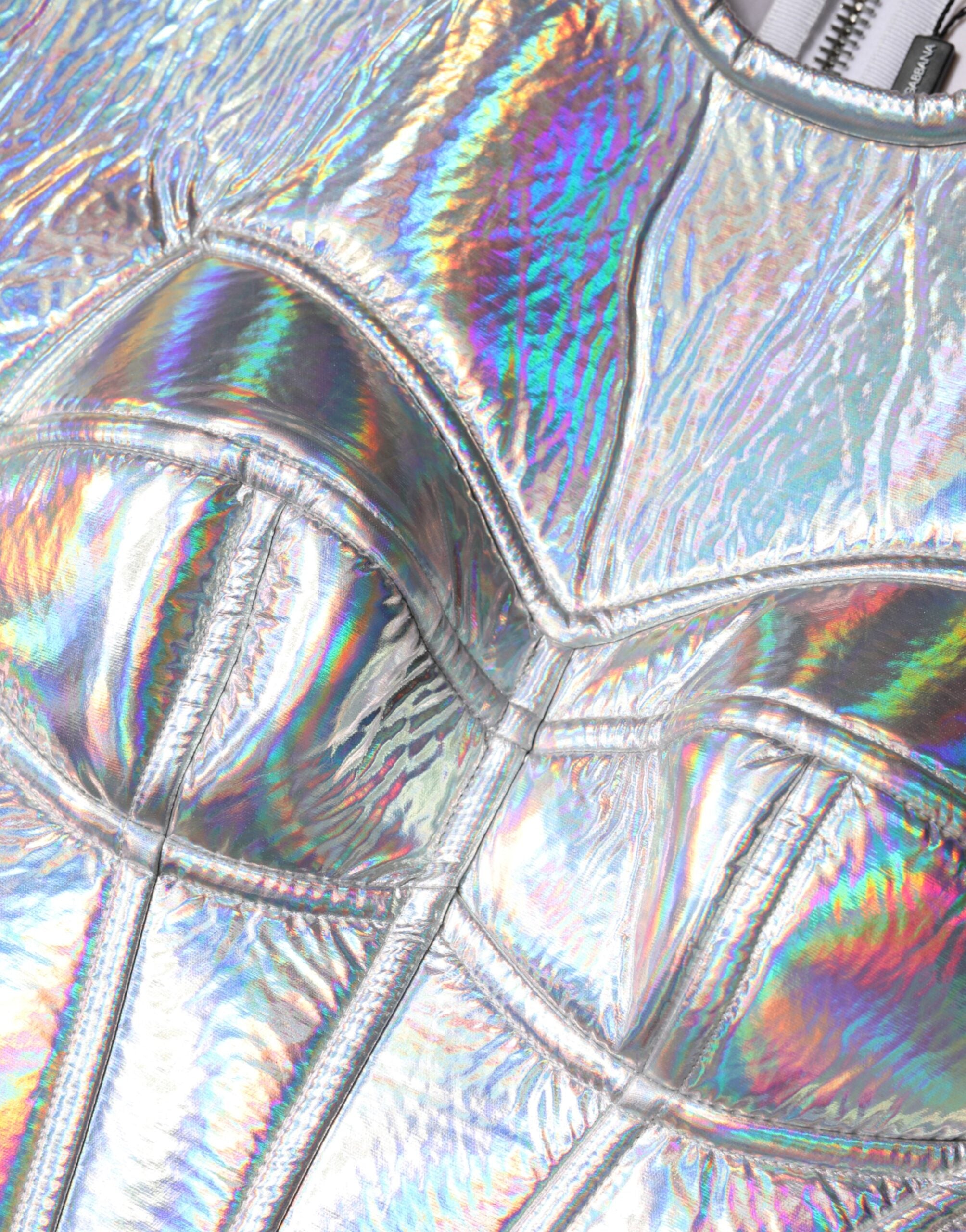 silver iridescent midi dress. Designed with a bodycon sheath silhouette, it hugs the figure while reflecting light for a stunning, attention-grabbing effect. Perfect for evening events, parties, or special occasions, this dress combines glamour, contemporary style, and Italian luxury craftsmanship.